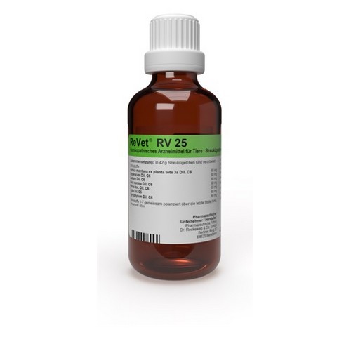 ReVet® RV 25 - oral - (Globuli) wird in etwas Wasser aufgelöst eingegeben. Die Globuli dürfen auch aufgelöst mit etwas Nahrung oder Tränke verabreicht werden. Die Häufigkeit und Dauer der Anwendung richtet sich in erster Linie nach den Grundsätzen der Homöopathie, wonach bei beginnender Besserung seltener dosiert wird und nach Erreichen des Normalzustandes zunächst keine weitere Anwendung erforderlich ist.